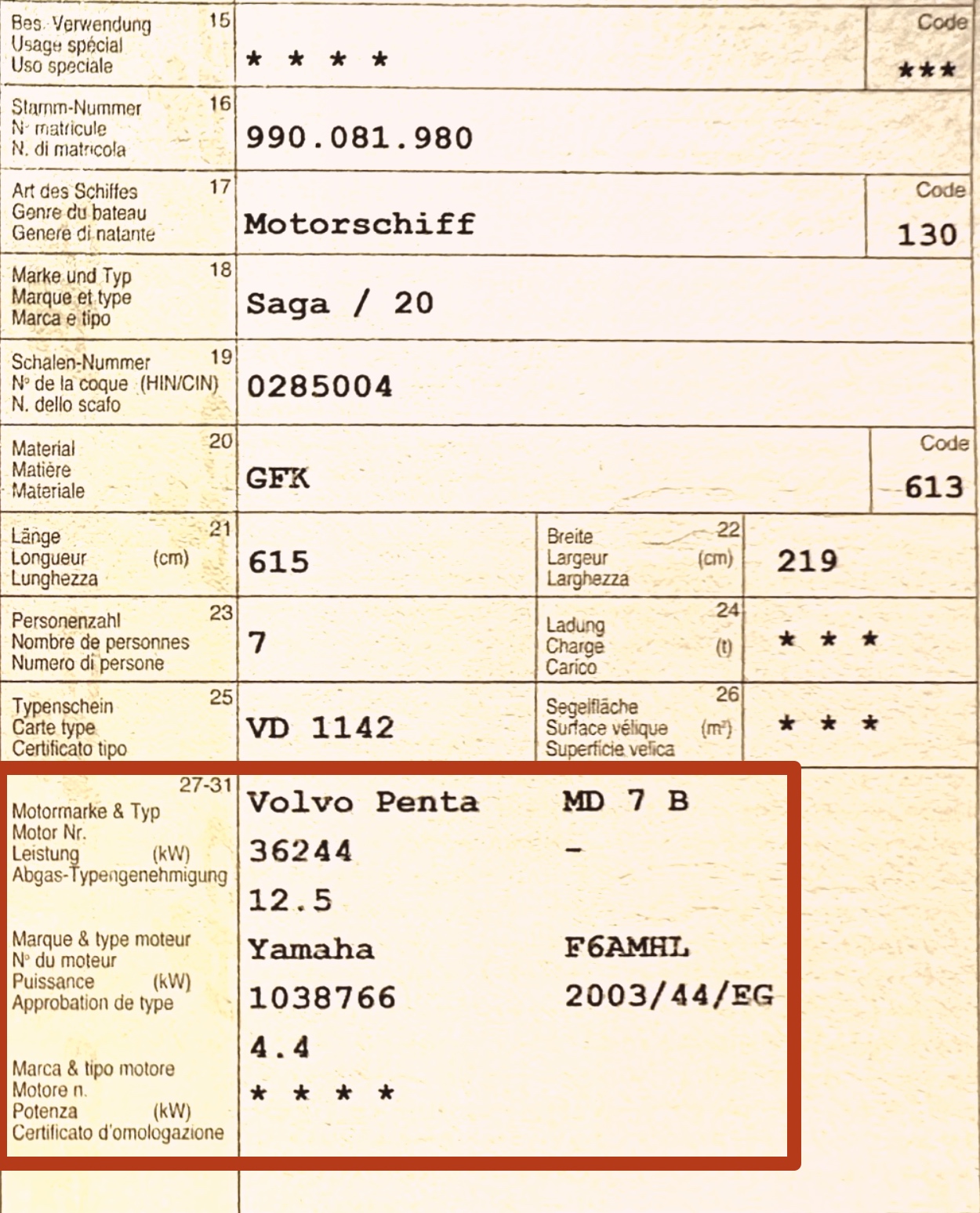 Nachfolgend erläutern wir, warum die SAGA 20 mit dem zweiten Motor mit 4.4 kW Antriebsleistung nicht ohne Schiffsführerausweis Kat. A gefahren werden darf.